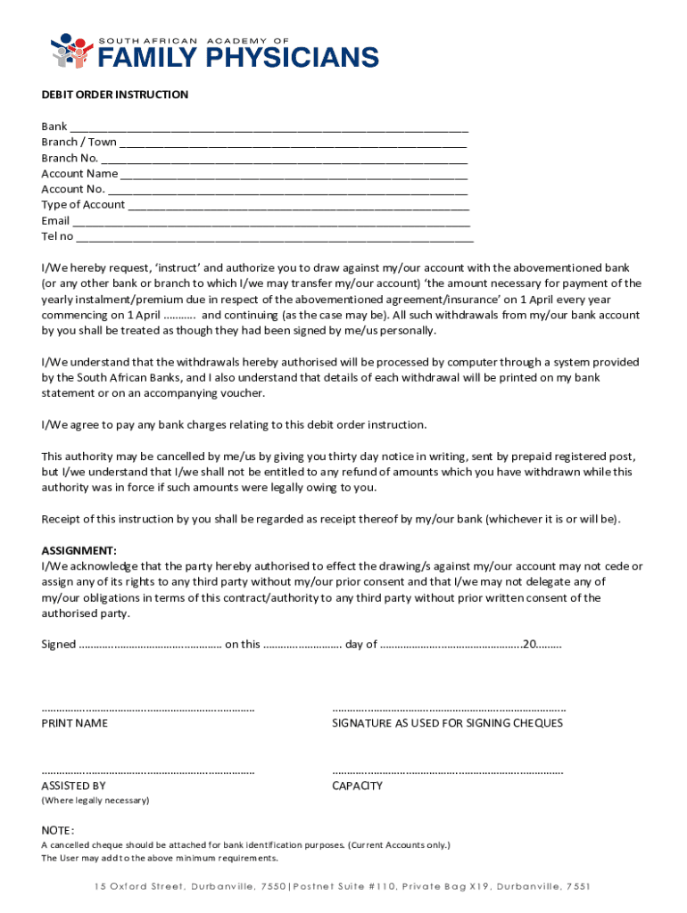 Get the free BANK DEBIT ORDER INSTRUCTION / AUTHORITY