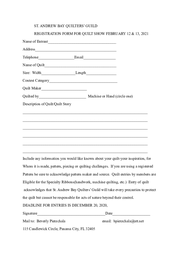 ST. ANDREW BAY QUILTERS GUILD REGISTRATION FORM FOR QUILT SHOW FEBRUARY 12 & 13, 2021 Name of Entrant Address Telephone Email Name of Quilt Size: Width Length Contest Category Quilt Maker Quilted