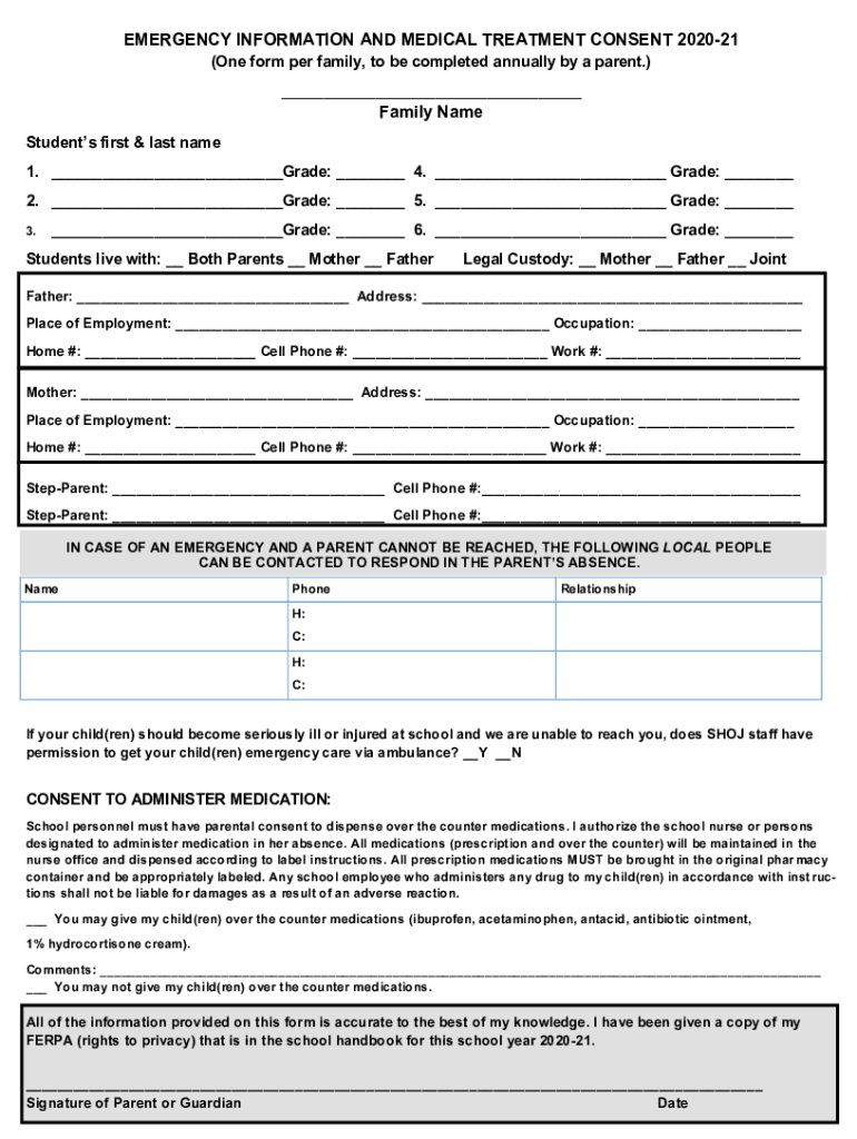 EMERGENCY INFORMATION AND MEDICAL TREATMENT CONSENT 202021 (One form per family, to be completed annually by a parent.) Family Name Students first & last name 1. Grade: 4. Grade: 2. Grade: 5. Grade:
