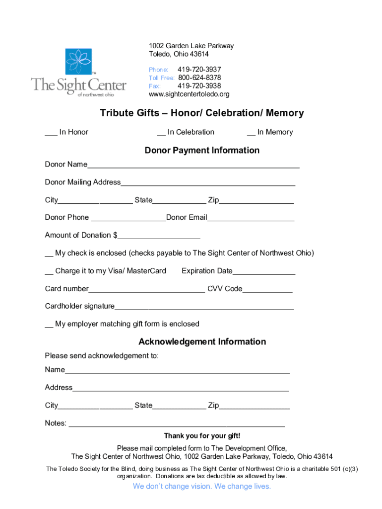 1002 Garden Lake Parkway Toledo, Ohio 43614 Phone: 4197203937 Toll Free: 8006248378 Fax: 4197203938www.sightcentertoledo.retribute Gifts Honor/ Celebration/ Memory In Honor In Celebration In MemoryDonor