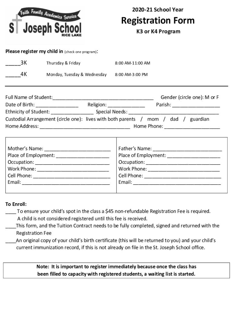 202021 School Preregistration Form K3 or K4 Program Please register my child in (check one program): 3KThursday & Friday8:00 AM11:00 AM 4KMonday, Tuesday & Wednesday8:00 AM3:00 Full Name of Student: