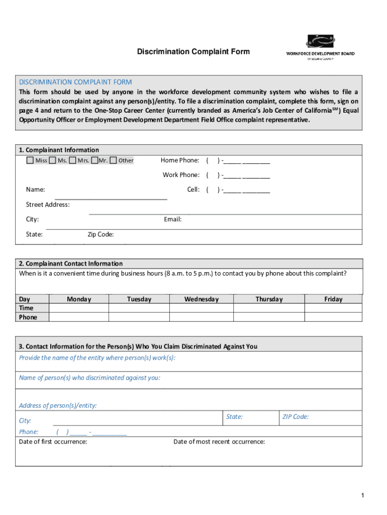 The purpose of the employment discrimination complaint form is to document and address instances of discrimination in the workplace.