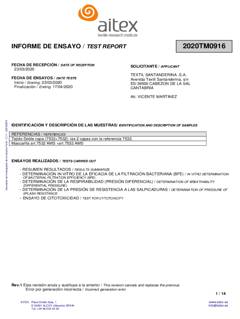 2020TM0916INFORME DE ENS AYO / TEST REPORT FEC HA DE RECEPTION / DATE OF RECEPTION 23/03/2020SOLICITANTE / APPLICANTFECHA DE ESSAYS / DATE TESTS Initio / Starting: 23/03/2020 Finalization / Ending: