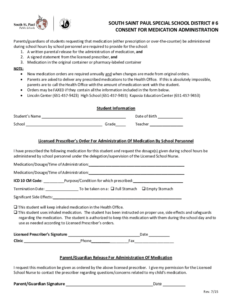 SOUTH SAINT PAUL SPECIAL SCHOOL DISTRICT # 6 CONSENT FOR MEDICATION ADMINISTRATION Parents/guardians of students requesting that medication (either prescription or overthecounter) be administered