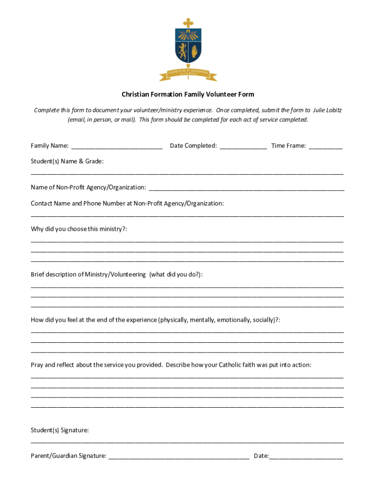 Christian Formation Family Volunteer Form Complete this form to document your volunteer/ministry experience. Once completed, submit the form to Julie Lolita (email, in person, or mail). This form