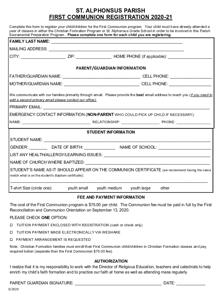 ST. ALPHONSE PARISH FIRST COMMUNION REGISTRATION 202021 Complete this form to register your child/children for the First Communion program. Your child must have already attended a year of classes