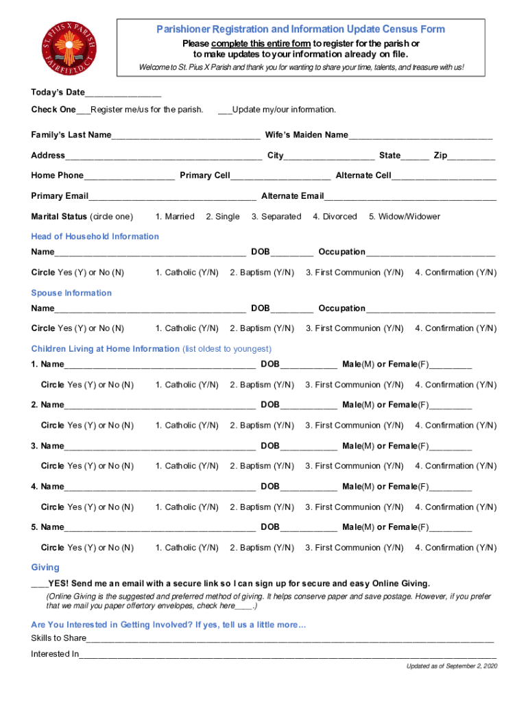 Parishioner Registration and Information Update Census Form Please complete this entire form to register for the parish or to make updates to your information already on file. Welcome to St. Pius