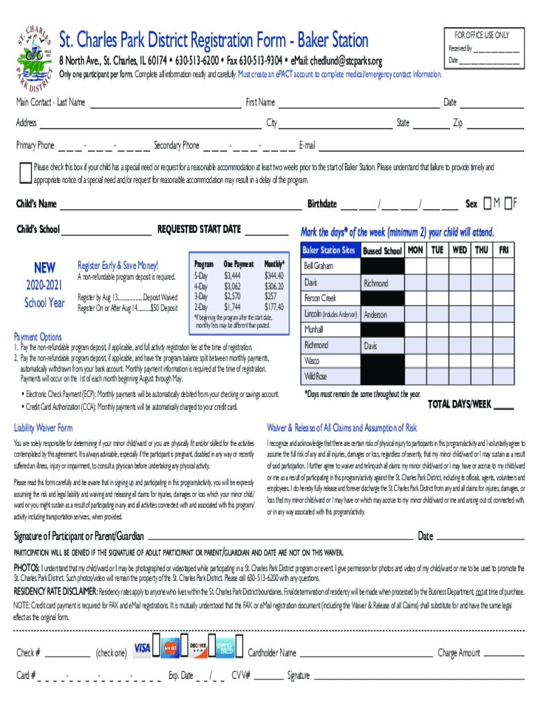 SHA R LES.CPA RKCTSINCE 1911DISTRISt. Charles Park District Registration Form Baker Stationer OFFICE USE ONLY Received By Date 8 North Ave., St. Charles, IL 60174 6305136200 Fax 6305139304 email: