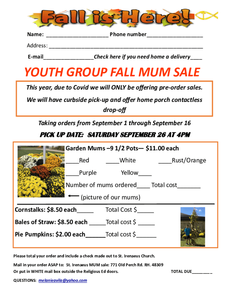 Name: Phone number Address: Email Check here if you need to home a delivery YOUTH GROUP FALL MUM SALE This year, due to COVID-19 we will ONLY be offering preorder sales. We will have curbside pickup