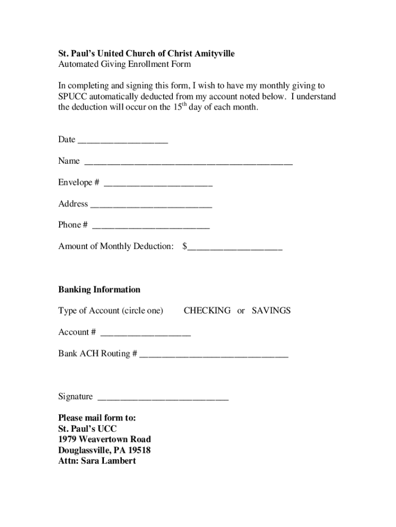 St. Paul's United Church of Christ Amityville Automated Giving Enrollment Form In completing and signing this form, I wish to have my monthly giving to SPUC automatically deducted from my account
