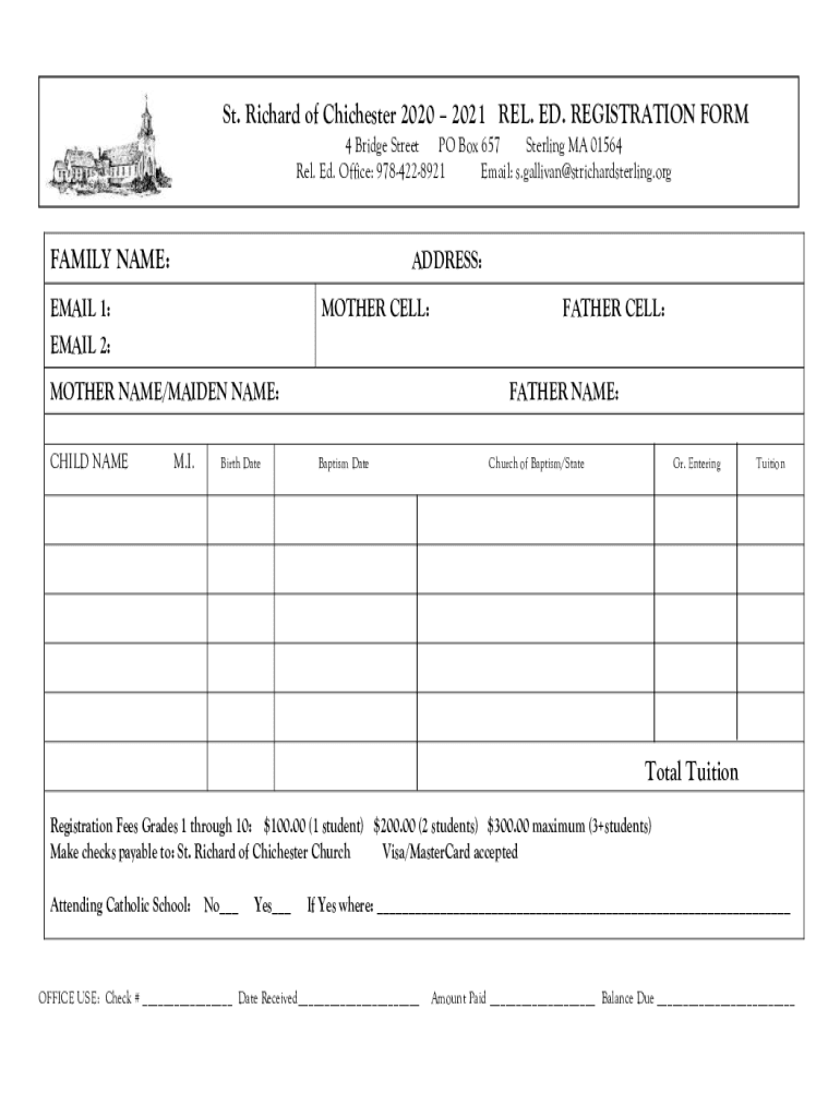 St. Richard of Colchester 2020 2021 REL. ED. REGISTRATION FORM 4 Bridge Street PO Box 657 Sterling MA 01564 Rel. Ed. Office: 9784228921 Email: s.gallivant strichardsterling. Family NAME:ADDRESS:EMAIL