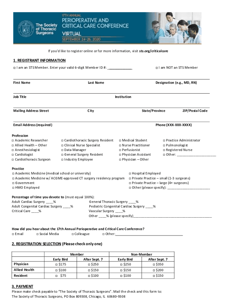 If you'd like to register online or for more information, visit sts.org/criticalcare1. REGISTRANT INFORMATION I am an STS Member. Enter your valid 6digit Member ID #: I am NOT an STS MemberFirst Redesignation