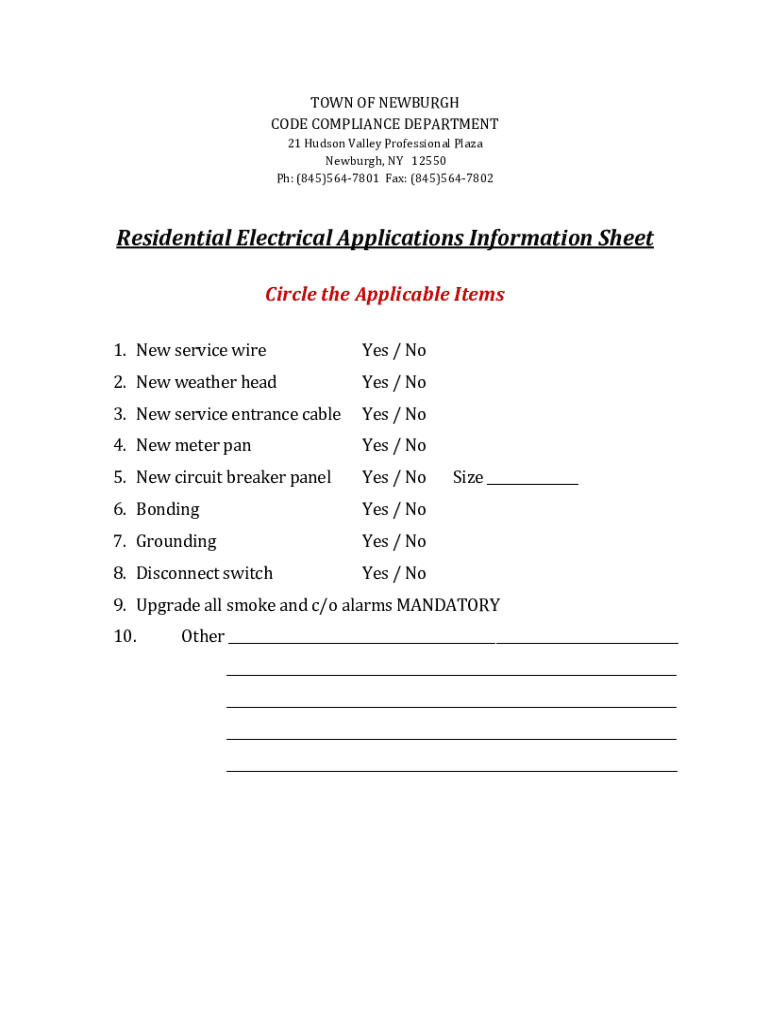 TOWN OF NEWBURGH CODE COMPLIANCE DEPARTMENT 21 Hudson Valley Professional Plaza Newburgh, NY 12550 pH: (845)5647801 Fax: (845)5647802Residential Electrical Applications Information Sheet Circle the
