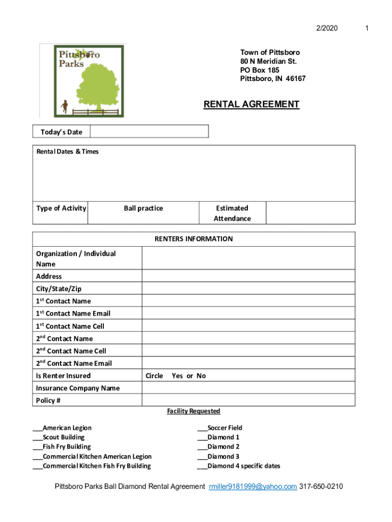 2/2020 Town of Pittsburgh 80 N Meridian St. PO Box 185 Pittsburgh, IN 46167RENTAL AGREEMENT Today's Date Rental Dates & Lifestyle of Activity Ball practiceEstimated AttendanceRENTERS INFORMATION Organization