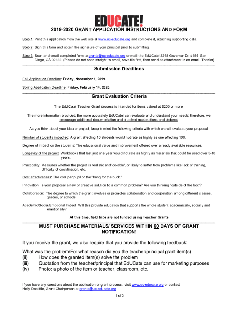 20192020 GRANT APPLICATION INSTRUCTIONS AND FORM Step 1: Print this application from the website at www.uceducate.org and complete it, attaching supporting data. Step 2: Sign this form and obtain