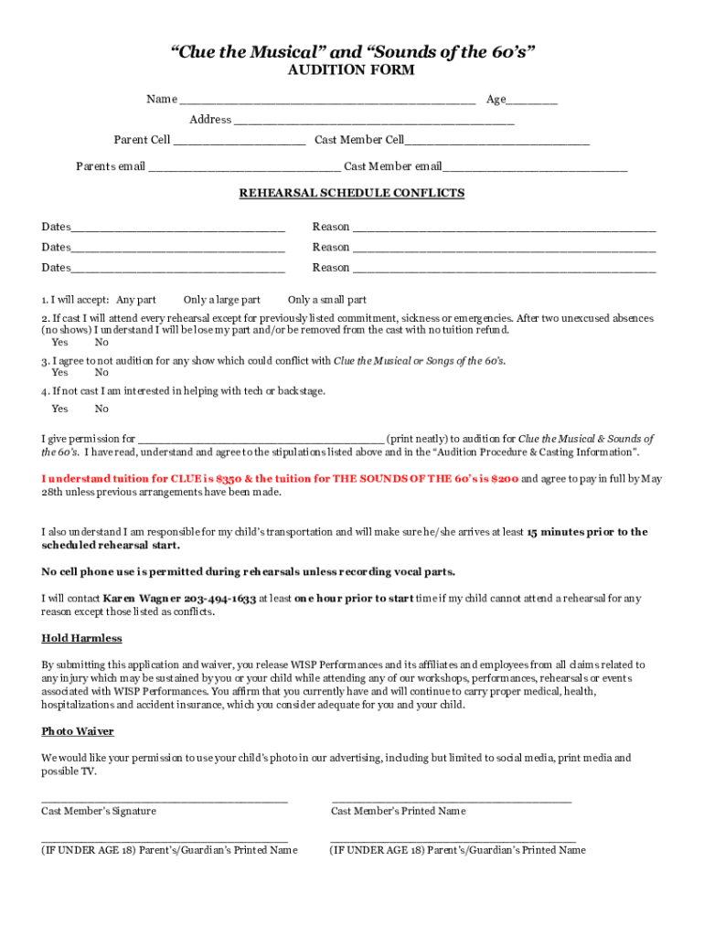 Clue the Musical and Sounds of the 60s AUDITION FORM Name Age Address Parent Cell Cast Member Cell Parents email Cast Member email REHEARSAL SCHEDULE CONFLICTS Dates Reason 1. I will accept: Any partly