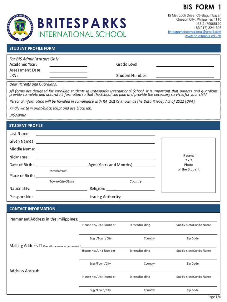 BIS FORM 1 15 Metropolis Drive, C5Bagumbayan Quezon City, Philippines 1110 +63(2) 79668120 +63(917) 3241706 britesparksinternational gmail.com www.britesparks.edu.phBRITESPARKS INTERNATIONAL SCHOOLSTUDENT