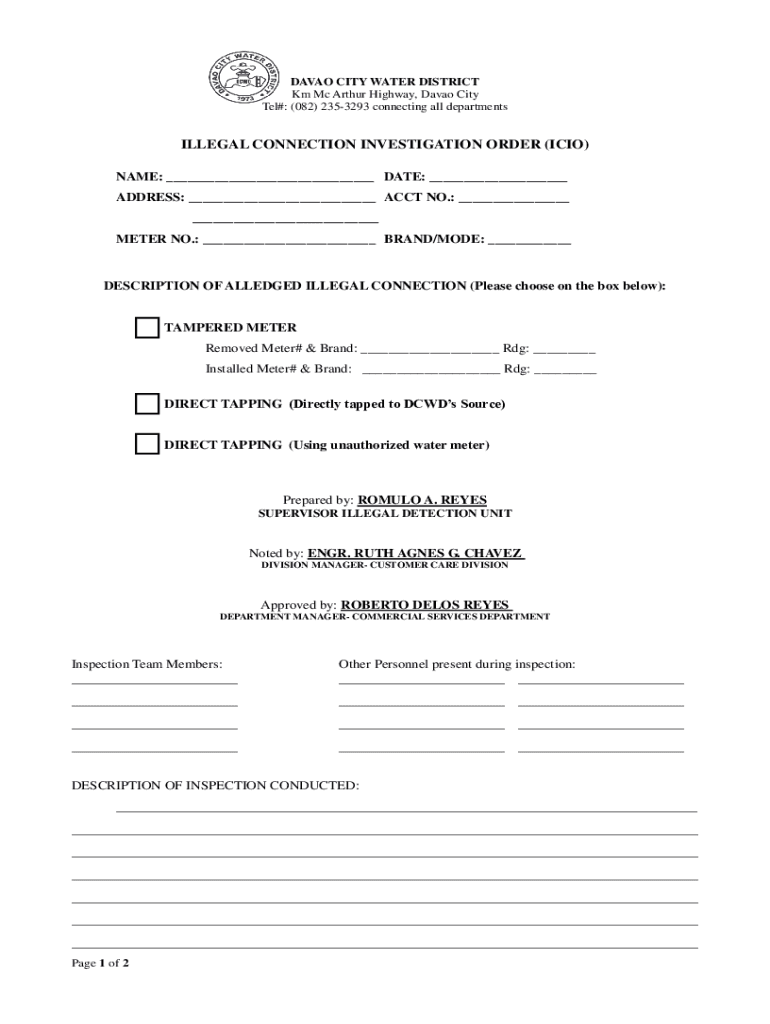 DAVAO CITY WATER DISTRICT Km MC Arthur Highway, Davao City Tel#: (082) 2353293 connecting all departmentsILLEGAL CONNECTION INVESTIGATION ORDER (CIO) NAME: DATE: ADDRESS: ACCT NO.: METER NO.: BRAND/MODE: