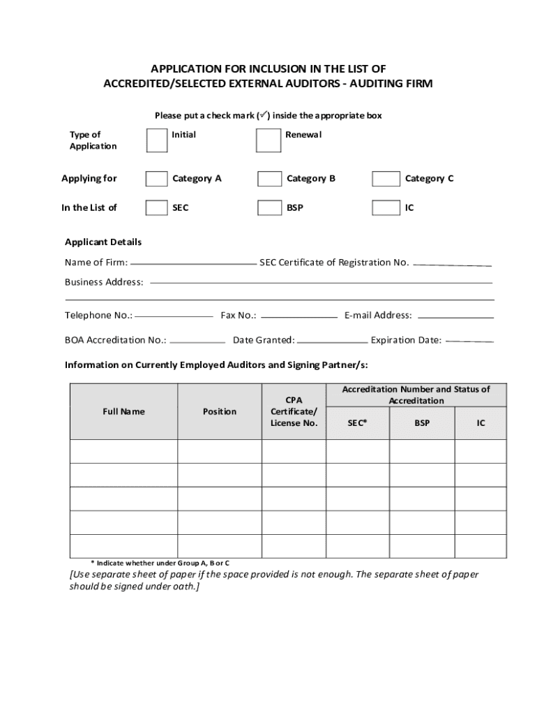 APPLICATION FOR INCLUSION IN THE LIST OF ACCREDITED/SELECTED EXTERNAL AUDITORS AUDITING FIRM Please put a check mark () inside the appropriate box Type of ApplicationInitialRenewalApplying category
