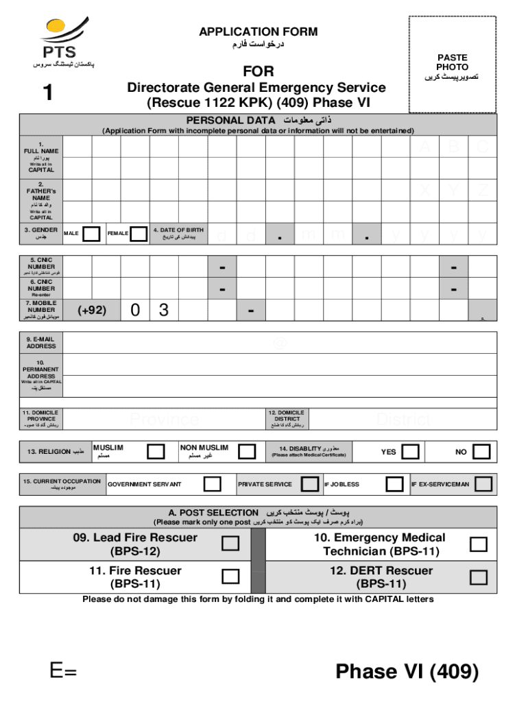 APPLICATION FORM PASTE PHOTO FOR Directorate General Emergency Service (Rescue 1122 PKK) (409) Phase VI1PERSONAL DATA (Application Form with incomplete personal data or information will not be entertained)A