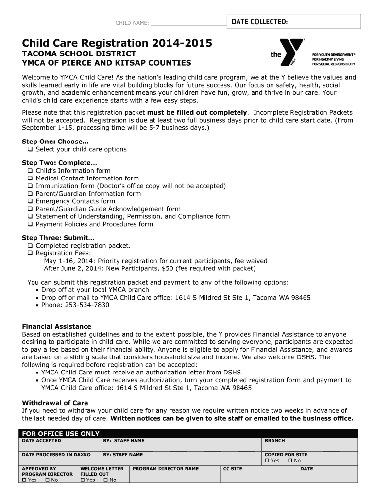 DATE COLLECTED: BIRTHDATE: CHILD NAME: Child Care Registration 2014-2015 TACOMA SCHOOL DISTRICT YMCA OF PIERCE AND KIT SAP COUNTIES Welcome to YMCA Child Care! As the nation s leading child care program,