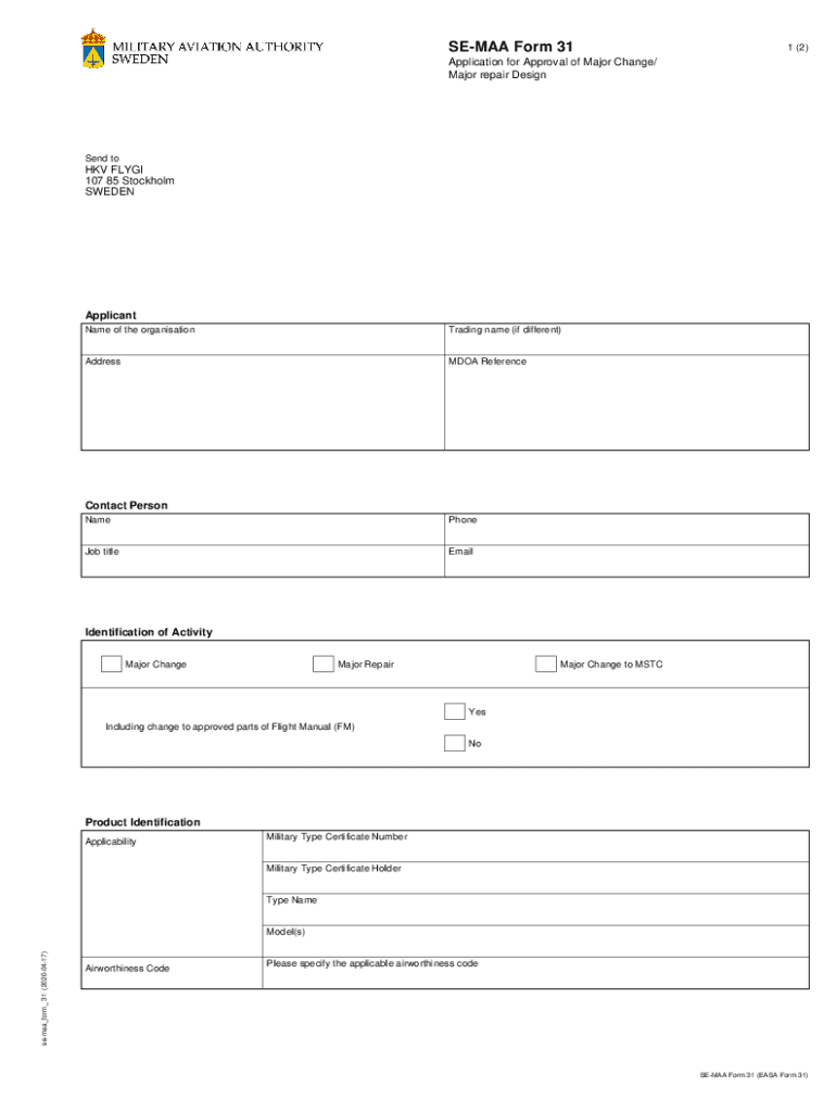 Get the free SE-MAA Form 31Application for Approval of Major Change/Major repair Design. Blankett...