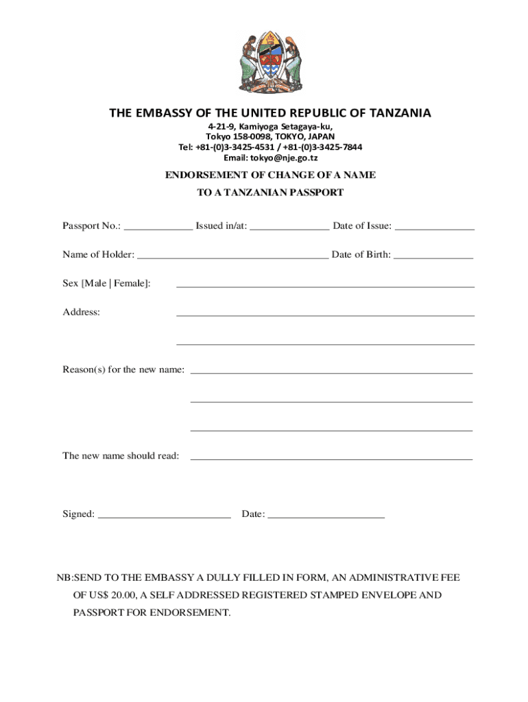 THEEMBASSYOFTHEUNITEDREPUBLICOF TANZANIA 4219, Amiga Setagayaku, Tokyo 1580098, TOKYO, JAPAN Tel: +81(0)334254531 / +81(0)334257844 Email: Tokyo née.go.endorsement OF CHANGE OF A NAME TO A TANZANIAN