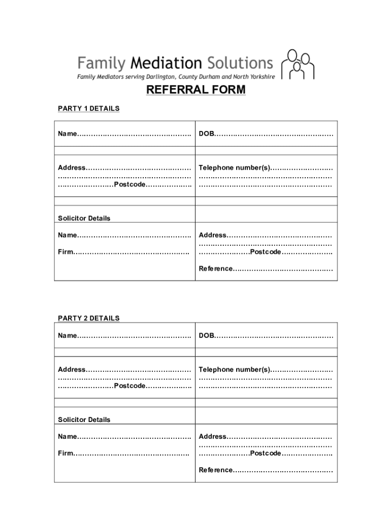REFERRAL FORM PARTY 1 DETAILS Name. Address Postcode. Telephone number(s) Solicitor Details Name.