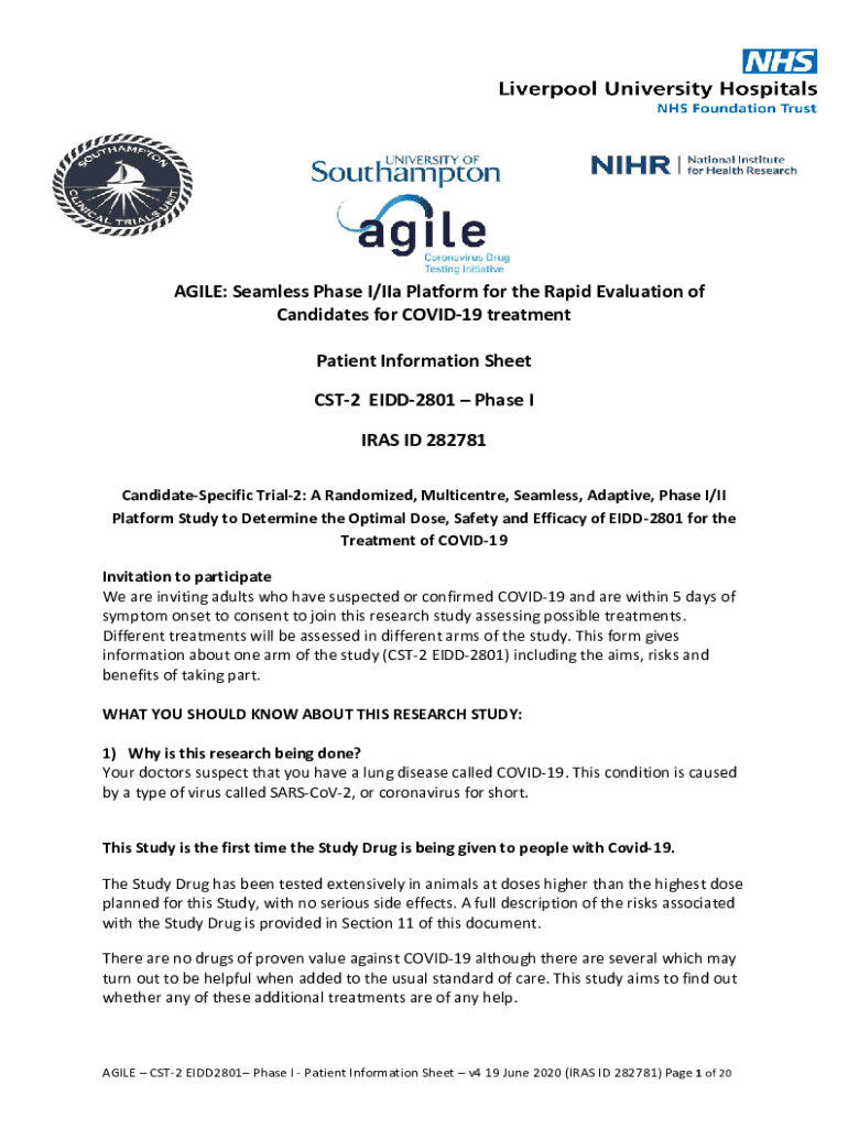 AGILE: Seamless Phase I/IIA Platform for the Rapid Evaluation of Candidates for COVID-19 treatment Patient Information Sheet CST2 EIDD2801 Phase I IRAS ID 282781 CandidateSpecific Trial2: A Randomized,
