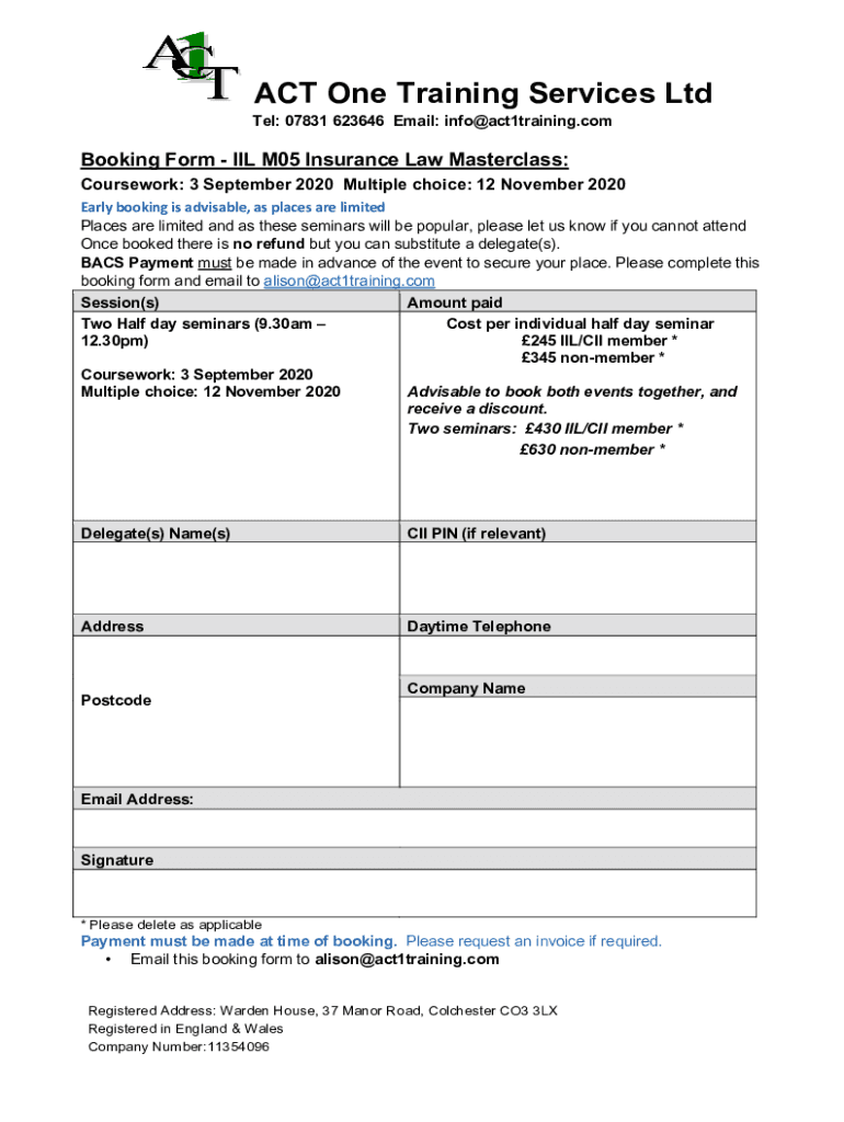 ACT One Training Services Lintel: 07831 623646 Email: info act1training. Combining Form OIL M05 Insurance Law Masterclass: Coursework: 3 September 2020 Multiple choice: 12 November 2020 Early booking