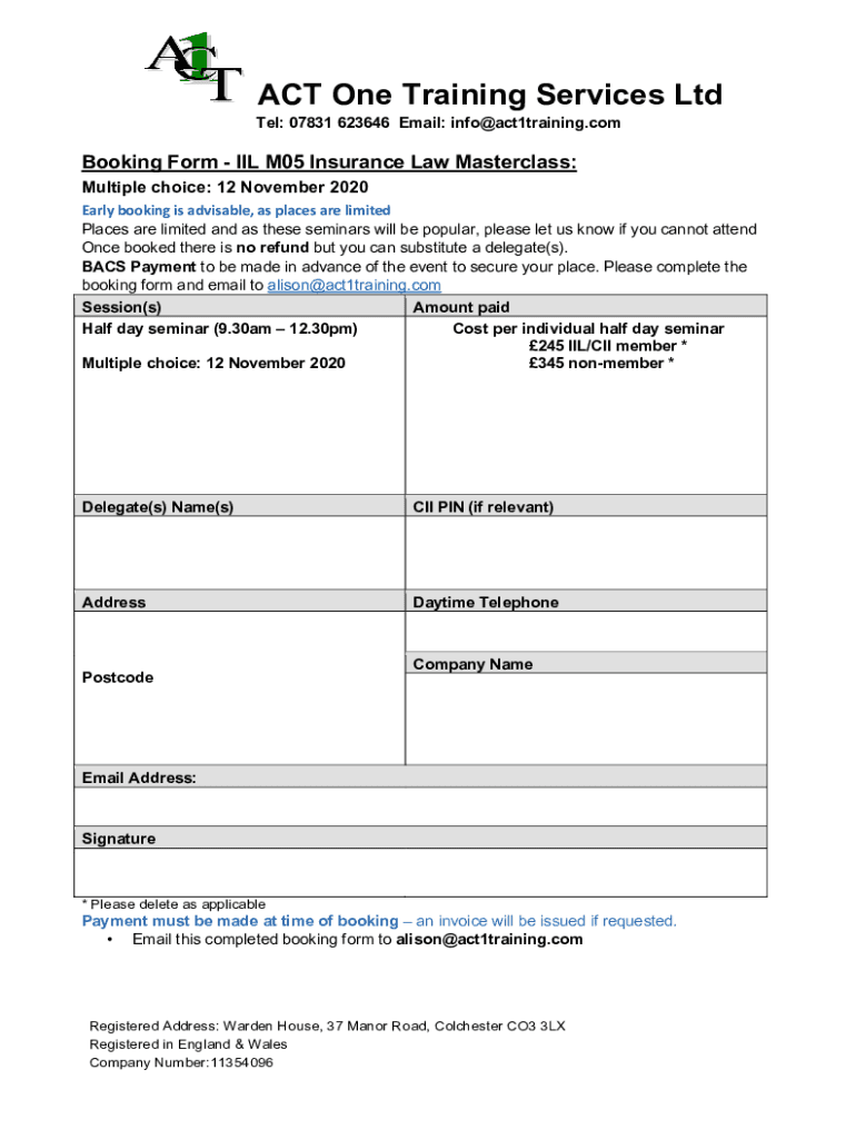 ACT One Training Services Lintel: 07831 623646 Email: info act1training. Combining Form OIL M05 Insurance Law Masterclass: Multiple choice: 12 November 2020 Early booking is advisable, as places are