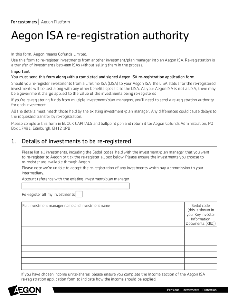 Get the free Aegon Platform Aegon ISA re-registration application form ...