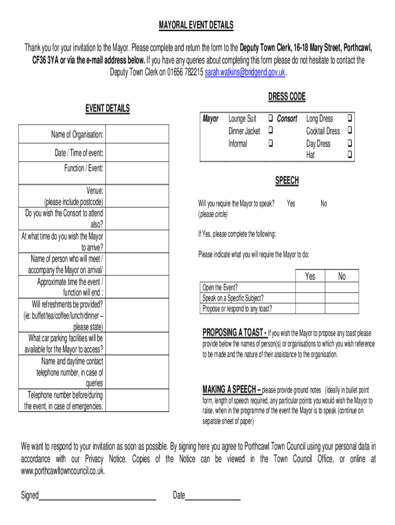 MAYORAL EVENT DETAILS Thank you for your invitation to the Mayor. Please complete and return the form to the Deputy Town Clerk, 1618 Mary Street, Portugal, CF36 3YA or via the email address below.