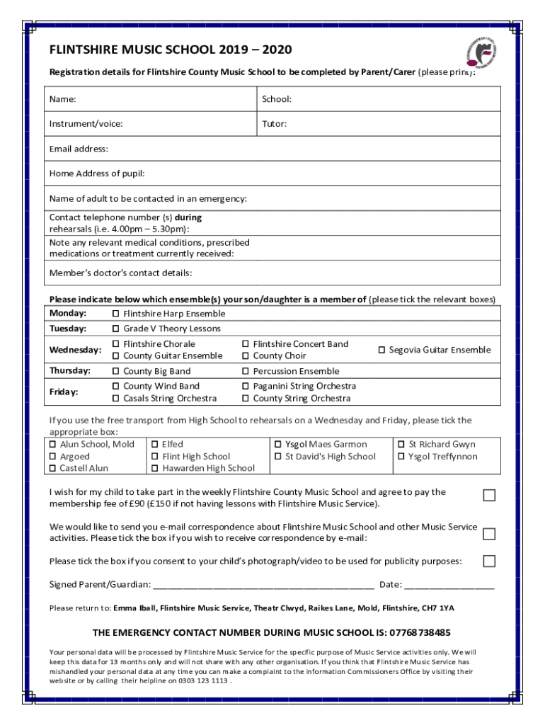 WILTSHIRE MUSIC SCHOOL 2019 2020 Registration details for Flint shire County Music School to be completed by Parent/Carer (please print): Name:School:Instrument/voice:Tutor:Email address: Home Address