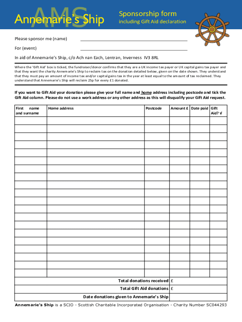 AMSAnnemaries ShipSponsorship form including Gift Aid declarationPlease sponsor me (name) For (event) In aid of Annemarie Ship, c/o ACH Nan Each, Lent ran, Inverness IV3 8RL Where the Gift Aid box