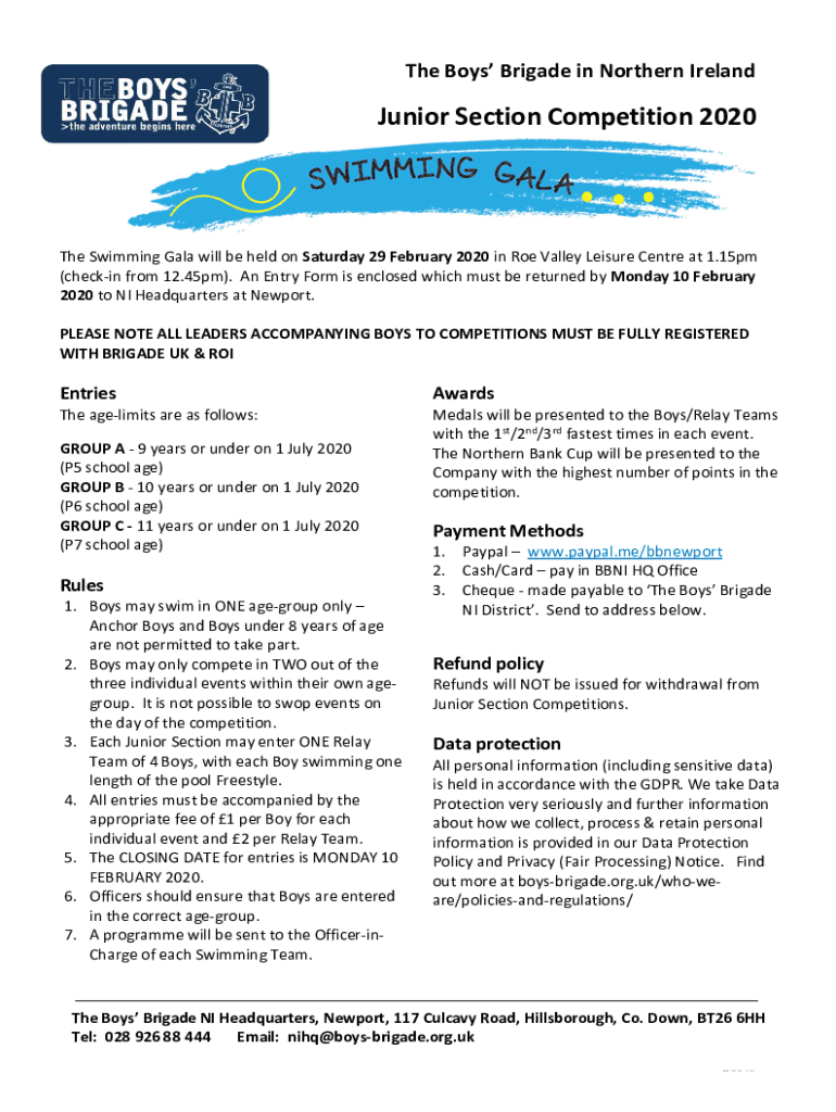 The Boys Brigade in Northern Ireland Junior Section Competition 2020The Swimming Gala will be held on Saturday 29 February 2020 in Roe Valley Leisure Center at 1.15pm (checking from 12.45pm). An Entry