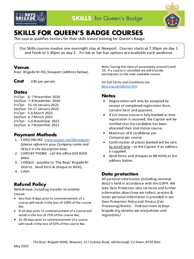 SKILLS FOR QUEENS BADGE COURSESThis course qualifies Seniors for their skills based training for Queens Badge