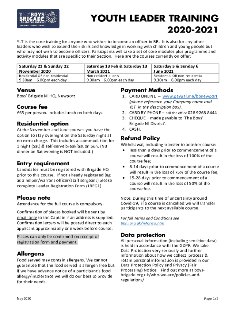 YOUTH LEADER TRAINING 20202021 YET is the core training for anyone who wishes to become an officer in BB. It is also for any other leaders who wish to extend their skills and knowledge in working