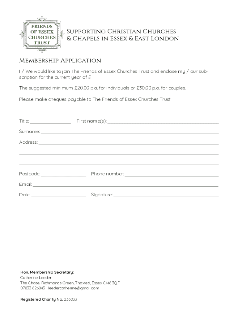 Supporting Christian Churches & Chapels in Essex & East London Membership Application I / We would like to join The Friends of Essex Churches Trust and enclose my / our subscription for the current