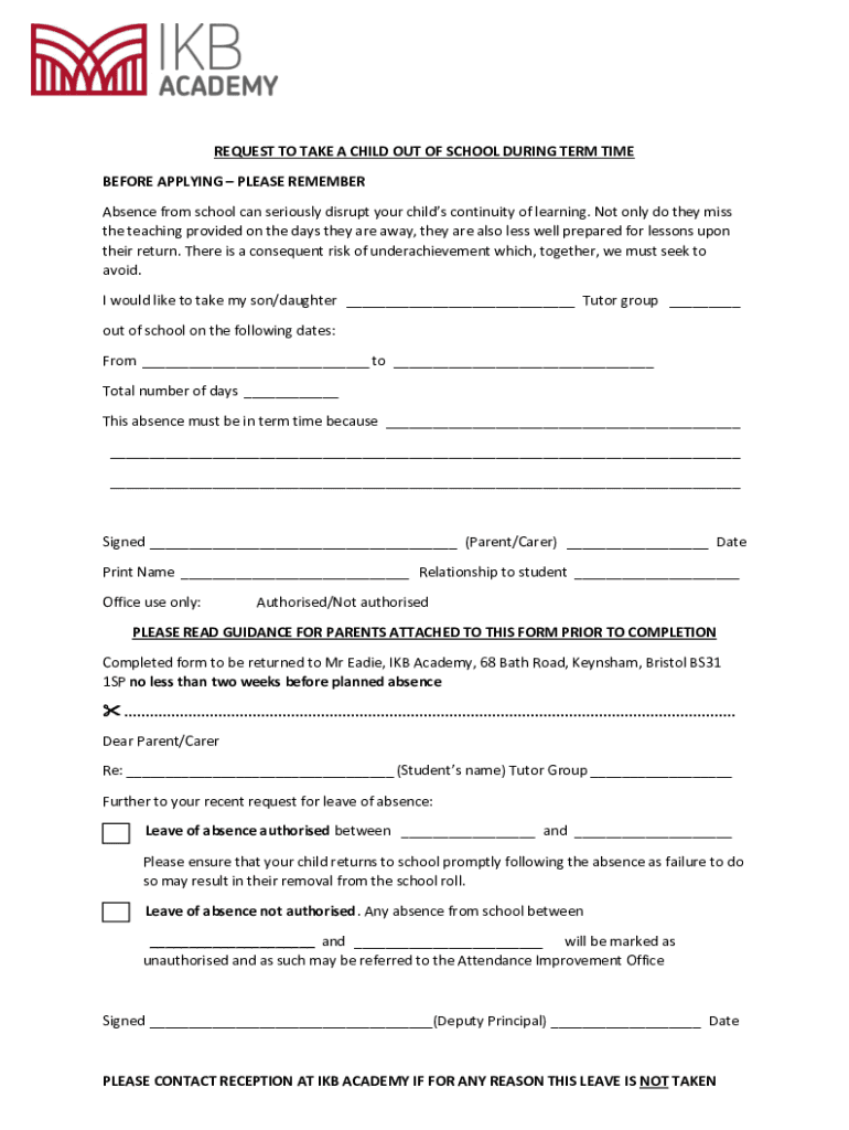 Get the free REQUEST TO TAKE A CHILD OUT OF SCHOOL DURING TERM TIME ...