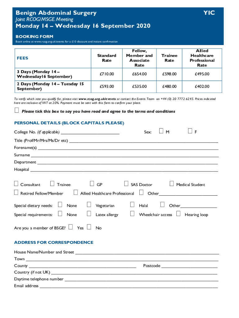 Benign Abdominal SurgeryYICJoint COG/MAGE Meeting Monday 14 Wednesday 16 September 2020 BOOKING FORM Book online at www.rcog.org.uk/events for a 10 discount and instant confirmationStandard RateFellow,
