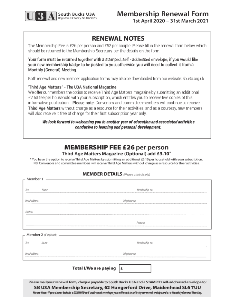 South Bucks U3ARegistered Charity No.1029873Membership Renewal Form1st April 2020 31st March 2021RENEWAL NOTES The Membership Fee is 26 per person and 52 per couple. Please fill in the renewal form