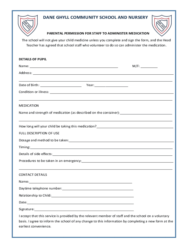 DANE HALL COMMUNITY SCHOOL AND NURSERYPARENTAL PERMISSION FOR STAFF TO ADMINISTER MEDICATION The school will not give your child medicine unless you complete and sign the form, and the Head Teacher