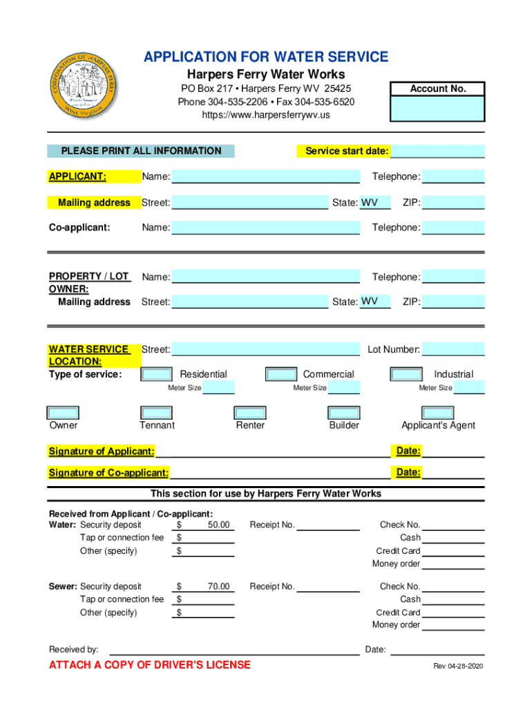 APPLICATION FOR WATER SERVICE Harper's Ferry Water Works PO Box 217 Harper's Ferry WV 25425 Phone 3045352206 Fax 3045356520 https://www.harpersferrywv.usPLEASE PRINT ALL INFORMATION APPLICANT: Mailing