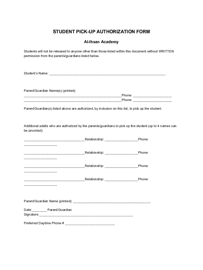 STUDENT PICKUP AUTHORIZATION FORM Alison Academy Students will not be released to anyone other than those listed within this document without WRITTEN permission from the parents/guardians listed below.