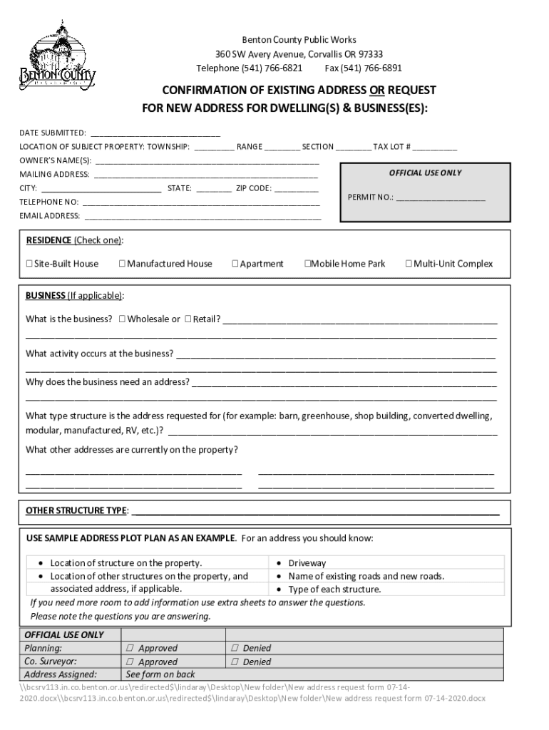 Benton County Public Works 360 SW Avery Avenue, Corvallis OR 97333 Telephone (541) 7666821 Fax (541) 7666891CONFIRMATION OF EXISTING ADDRESS OR REQUEST FOR NEW ADDRESS FOR DWELLING(S) & BUSINESS(ES):