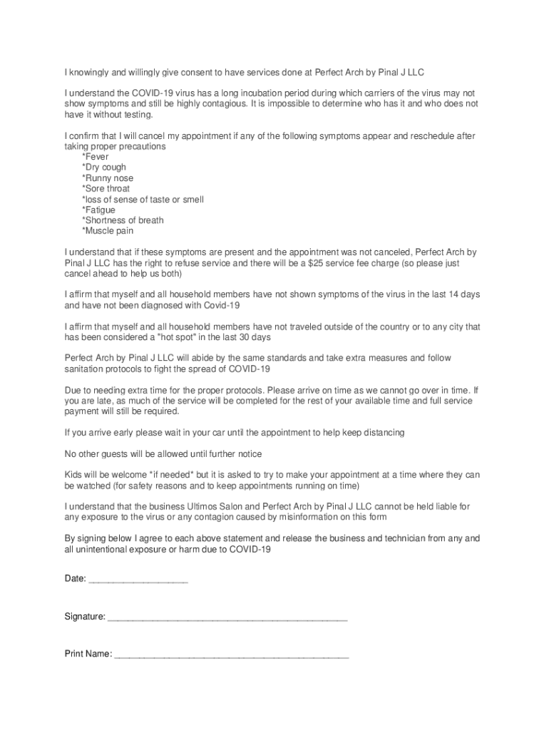 I knowingly and willingly give consent to have services done at Perfect Arch by Final J LLC