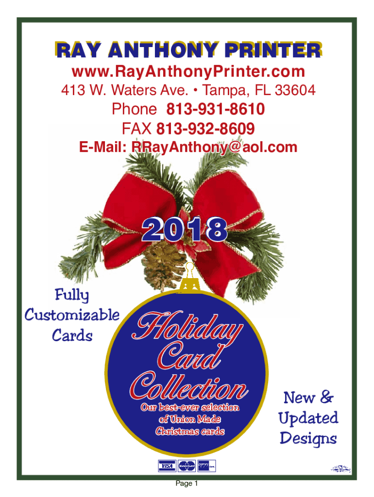 Ray Anthony Printer www.RayAnthonyPrinter.com413 W. Waters Ave. Tampa, FL 33604Phone 8139318610 FAX 8139328609EMail: RRayAnthony AOL.com2018 2018 Fully Customizable Cards Holiday Card Collection Our