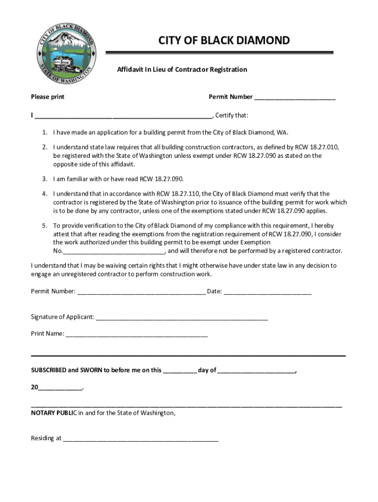 CITY OF BLACK DIAMOND Affidavit In Lieu of Contractor RegistrationPlease printPermit Number I, Certify that: 1. I have made an application for a building permit from the City of Black Diamond, WA.