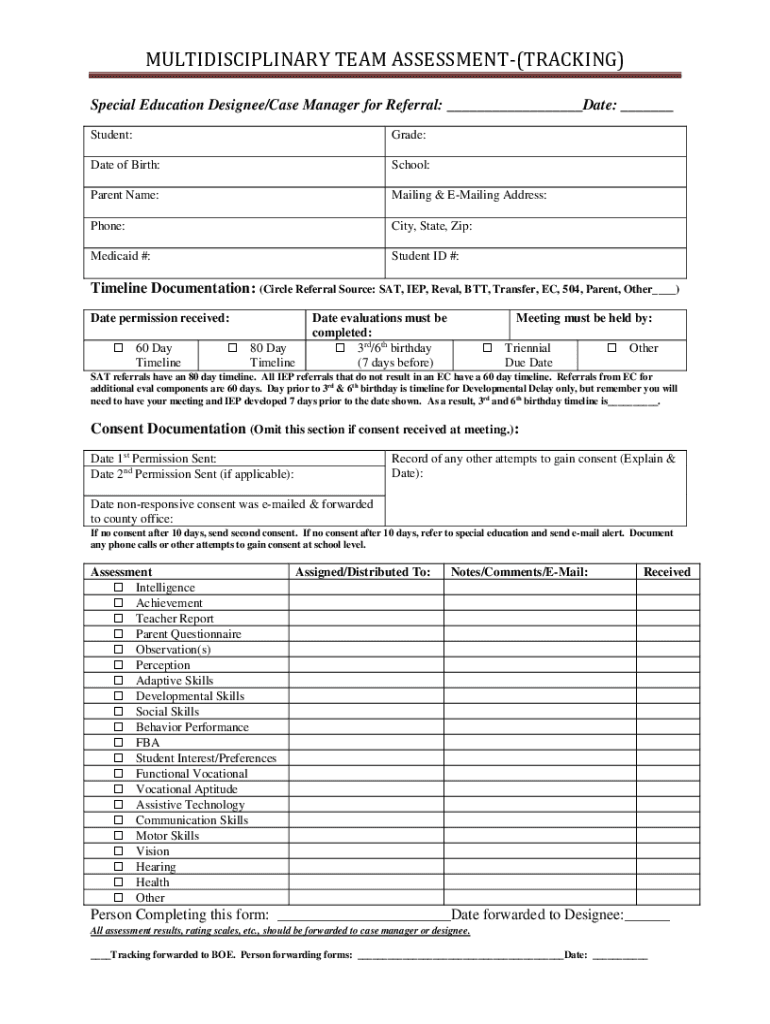 MULTIDISCIPLINARY TEAM ASSESSMENT(TRACKING) Special Education Designee/Case Manager for Referral: Date: Student:Grade:Date of Birth:School:Parent Name:Mailing & Emailing Address:Phone:City, State,